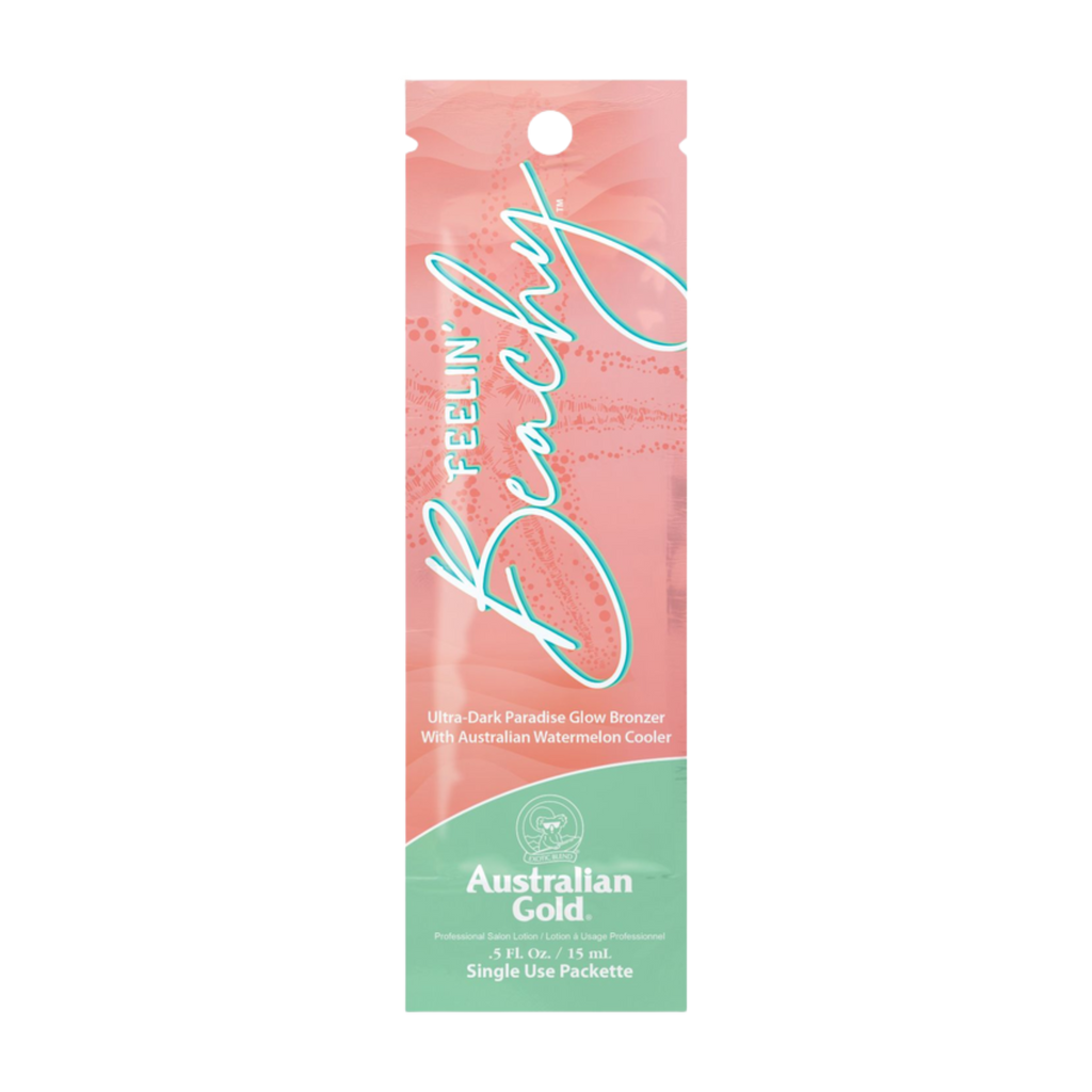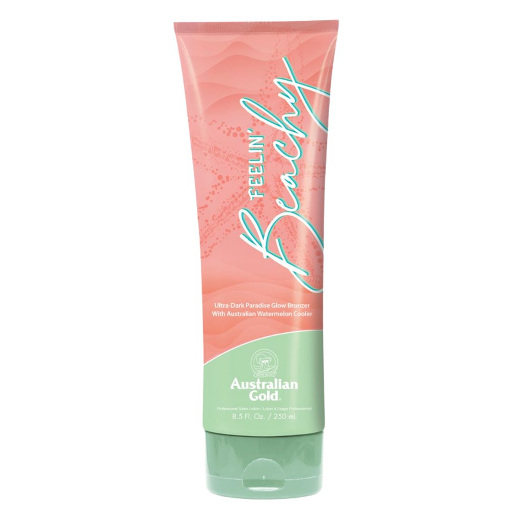Australian Gold Feelin’ Beachy! is an ultra-dark hybrid bronzer tanning lotion designed for trade customers and salon professionals who want instant colour with longer-lasting bronzing results. This Paradise Glow formula delivers immediate colour through Caramel while a low-DHA blend with Algae Extract enhances gradual bronze development for deeper, longer-lasting results. Enriched with the Australian Watermelon Cooler, Polished Perfection oils and the antioxidant-rich Vitalize Blend, it deeply hydrates, smooths and conditions the skin for a radiant, beach-ready glow.